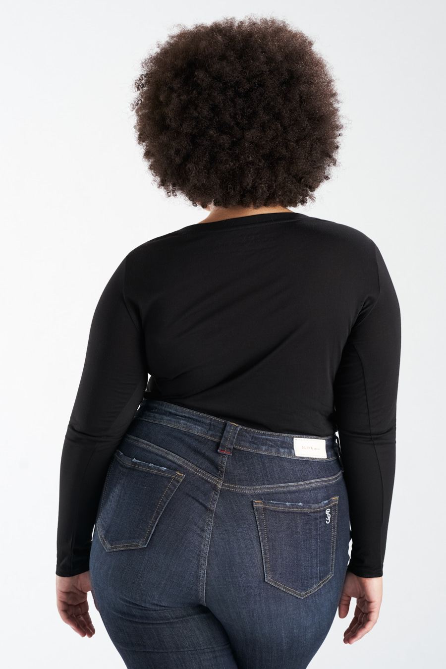 The pre washed long Sleeve V Neck Tee delivers a ultra chic high-low hemline. This slightly sheer tee is soft to the touch with a cotton/modal blend fabric that features the comfort of stretch